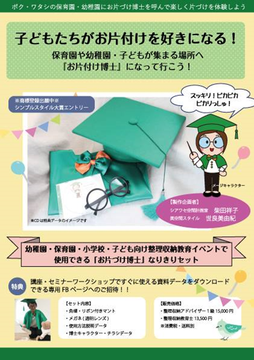 お片づけ博士なりきりキットと、ワークショップやセミナー等をご提案するための資料(営業ツール)のセット販売です。