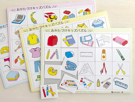 「洋服」「おもちゃ」「文房具」「日用品」の4種類が、それぞれ20ピースずつのパズルになっています。それらのピースを使って、「さがす」「わける」「えらぶ」「ならべる」「まとめる」などを体験しながら、お片づけを学べます。お片づけは楽しい♪そんな経験が、子どもたちのお片づけ力を育みます。